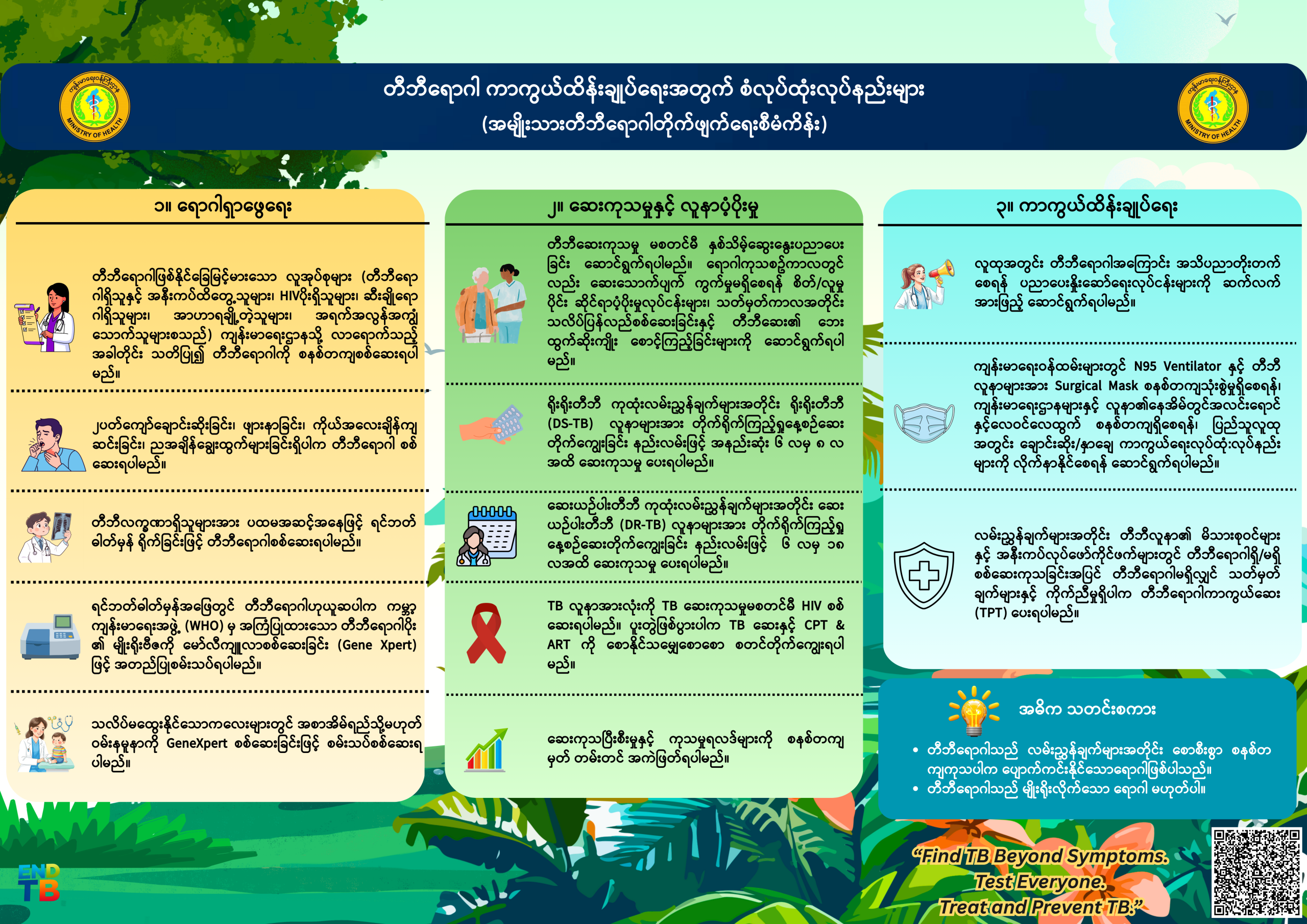 (၂) တီဘီရောဂါ ကာကွယ် ကုသခြင်း လုပ်ငန်းကို ပြည်သူ တစ်ရပ်လုံး လက်လှမ်း မီသော ကျန်းမာရေး စောင့်ရှောက်မှု အဖြစ် ထည့်သွင်း ဆောင်ရွက်ရန်